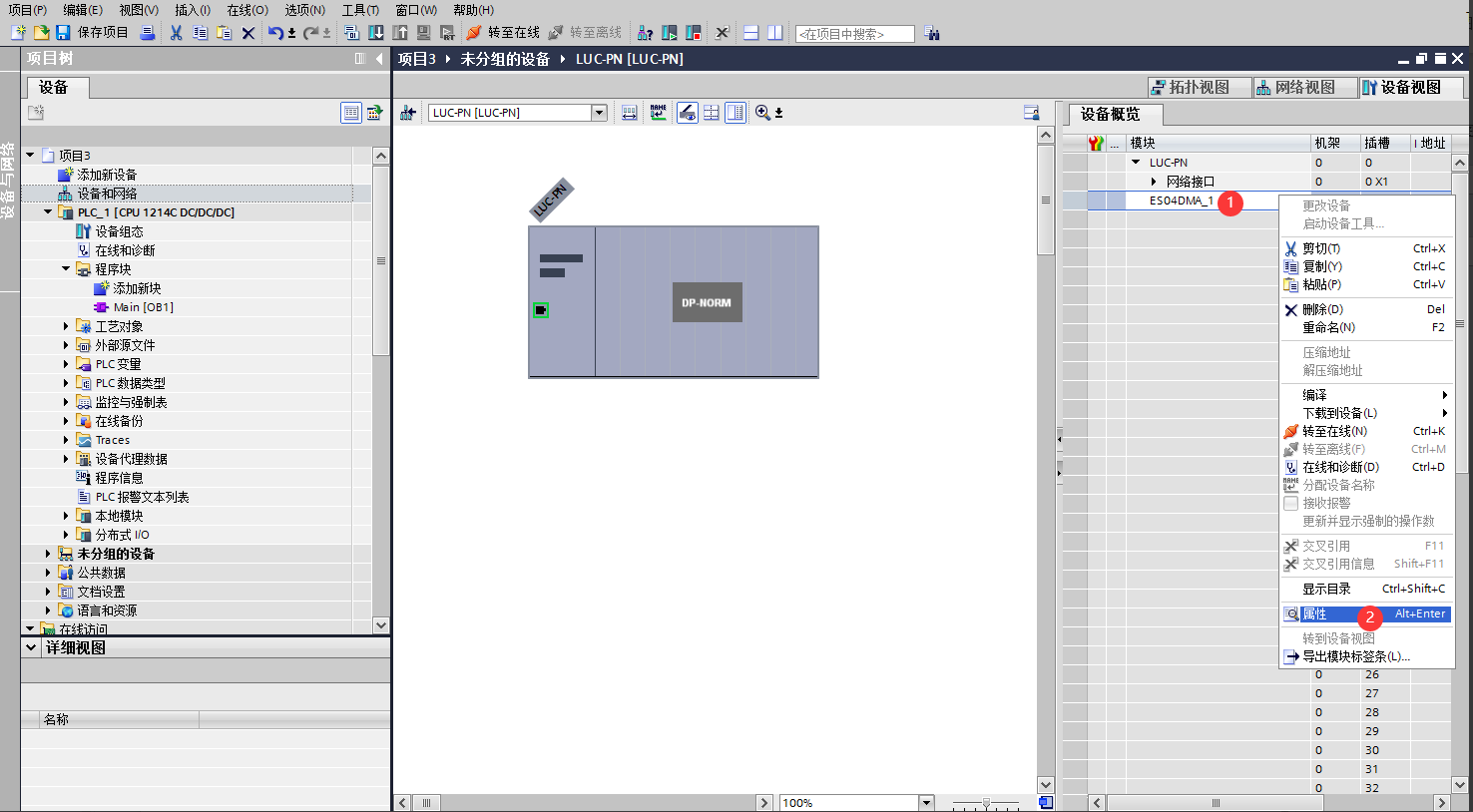 添加ES-04DMA硬件。雙擊后TIA Portal軟件右上角區域會出現LUC-PN擴展模塊的信息。先選中插槽1,再選擇“功能模塊_脈沖”再雙擊ES04DMA。