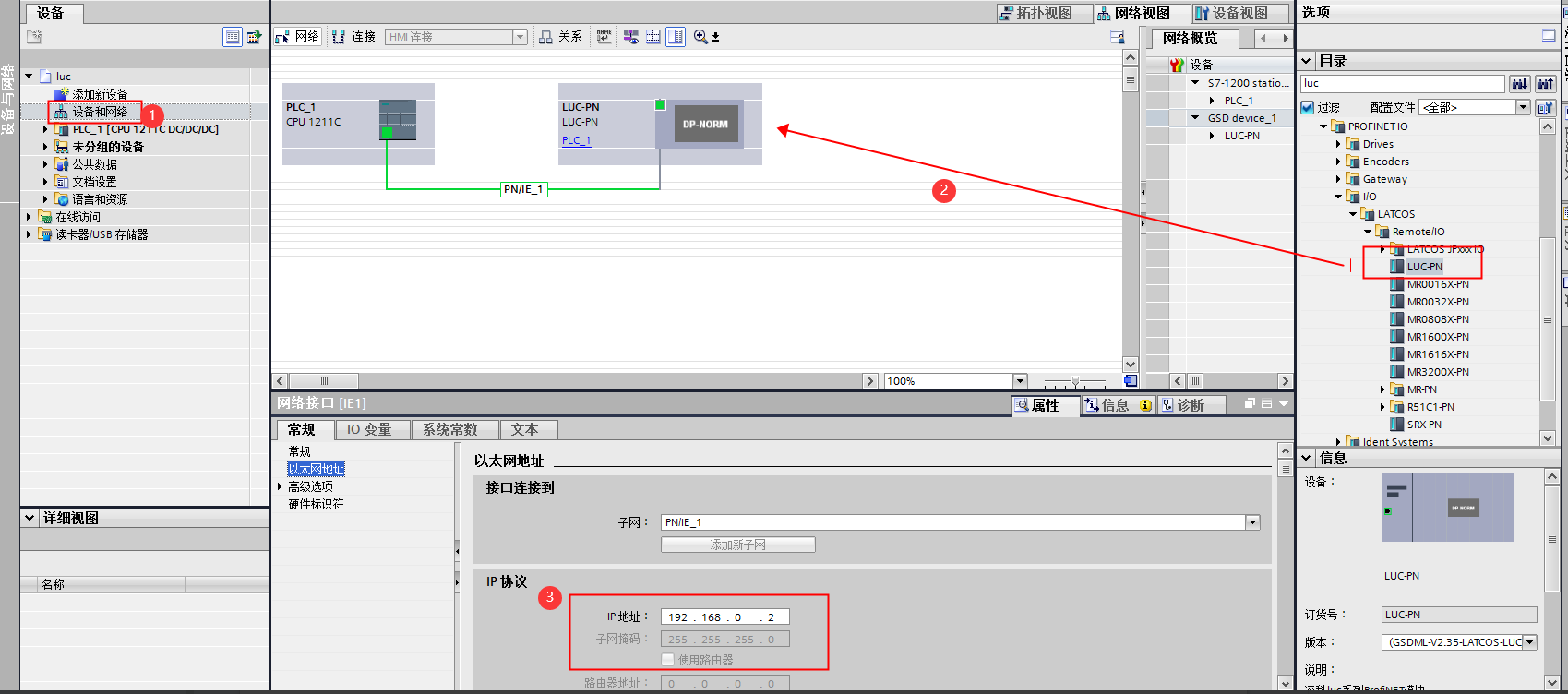 添加LUC-PN模塊。選擇中間界面的“網絡視圖”,在右側硬件目錄找到“LUC-PN” 拖拽到左側網絡視圖,并設置IP地址: