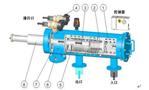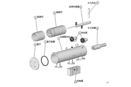 水力驅(qū)動自清洗過濾器由主管組件、端蓋組件、細濾芯組件、粗濾芯組件、吸污器組件、水力馬達、水力缸組件、排污閥、管路控制系統(tǒng)等主要零部件組成。水由入水 口進入過濾器,首先經(jīng)過粗濾芯組件濾掉圈套顆粒的雜質(zhì),然后到達細濾網(wǎng),通過細濾網(wǎng)濾除細小顆粒的雜質(zhì)后,清水由出水口排出。