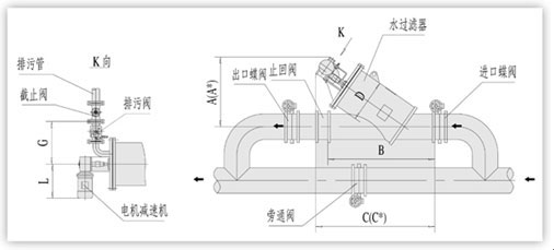 型號 管徑 (mm) 過濾流量 (m3/h) 過濾面積 (cm3) 排污閥DN (mm) 一次清洗 水量(L) 電機功率 (KW) 重量 (Kg) D (mm) A (mm) A (mm) B (mm) C (mm) C (mm) L (mm) G (mm)